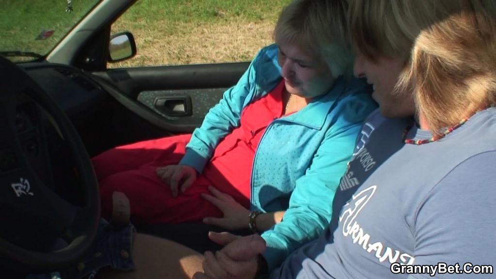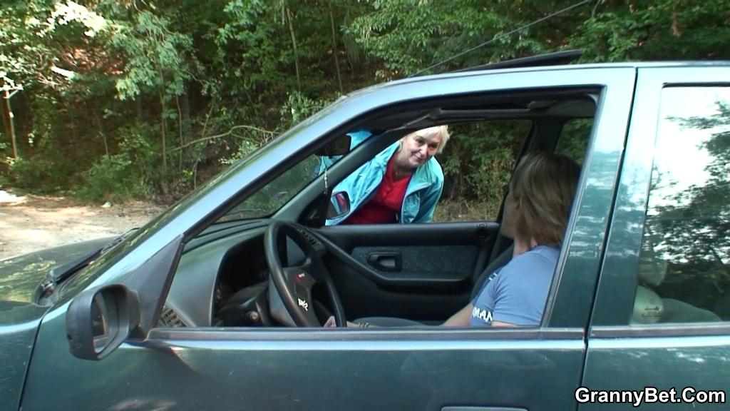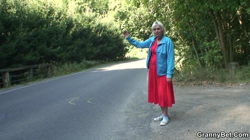 :: Granny picked up hitchhiking and he gets to fuck her naughty pussy outdoors as payment