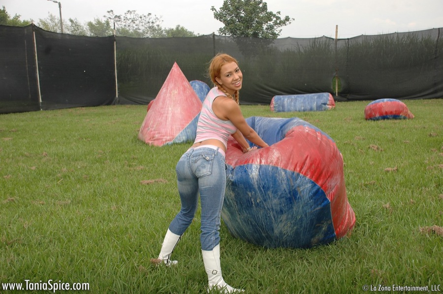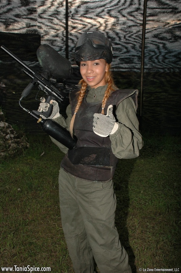 :: Tania Spice gets dressed up on her paintball gear and has some fun